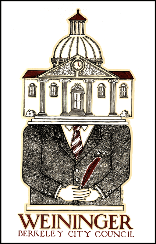 My old friend Harry Weininger took it into his head to run for public office, which I thought was just about the dumbest thing he'd ever done in his life. So, when he asked me to design a campaign poster for him I did, but I have to admit that I had mixed motives. I didn't precisely want him to lose, but if he won I didn't precisely want it to be my fault, either. So, you may notice that this blockheaded public official is hiding one sinister hand with the other, making some sort of secret deal with himself. The clock reads quitting time, but he's still on the job, tireless in the pursuit of blind power. Harry didn't win, which was a good thing for us and a good thing for him, too. As Alphonse de Lamartine remarked in 1850, "The more I see of the representatives of the people, the more I admire my dogs." And I'm not even that fond of dogs. |