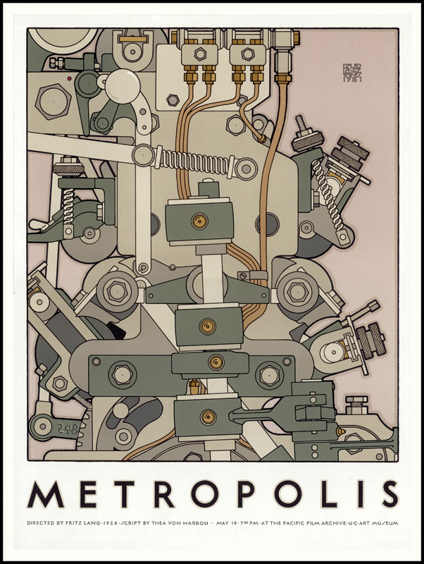 (#91) METROPOLIS: Edition of 2143 of which 300 copies are signed 1-300, 26 are signed A-Z, and five sets are signed as progressives. April 9, 1981 13 colors 18" x 24" Client: Tom Schmidt, The Pacific Film Archive, UC Art Museum, Berkeley CA 94720. Telephone (510) 642-1413 A-Z: Artist's own use. Progressives: One set to The Pacific Film Archive Robertson. (Print, July/August 1982) Model: The artist's ATF Solna Chief 24 Offset Lithographic Press |